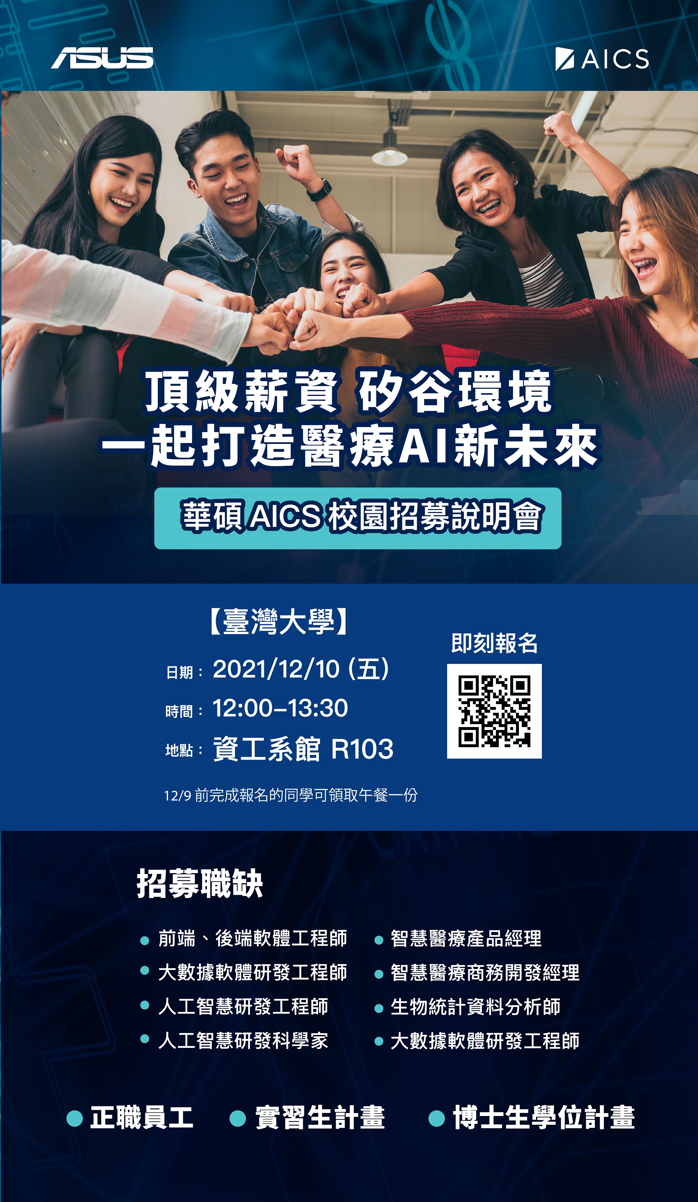 各位同學好, 華碩 AI 研發中心 (AICS) 校園招募開跑囉~ 我們是 #AICSBreakers,與眾不同、使命召喚、創業精神、迭代優化,透過科技的力量翻轉台灣醫療未來,減少病人與醫護負擔,帶來更多笑顏。在這裡,你將與全球雲端軟體、深度學習、數據分析的產業精英腦力激盪,在醫療數位轉型的浪潮中高速成長,成為全端整合與跨域應用的全才,還將落實研發成果到全球合作夥伴醫院,創造影響、發揮價值。如果你擁有與我們相同的核心理念,並具備創意、熱情、團隊合作等美好特質,請加入 AICS 的頂尖陣容,幫助台灣優秀的醫療體系智慧升級!