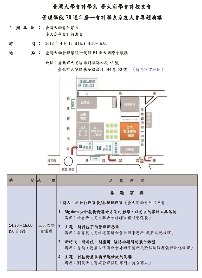今年是本校創立90週年(1928~2018),並適逢管理學院(前身:商學系)成立70週年(1948~2018)。 為配合管理學院70年週年慶,本系特於4月13日星期五14:30至16:00,假本校管理學院一號館B1正大國際會議廳,辦理「會計學系系友大會專題演講」。歡迎共襄盛舉! |