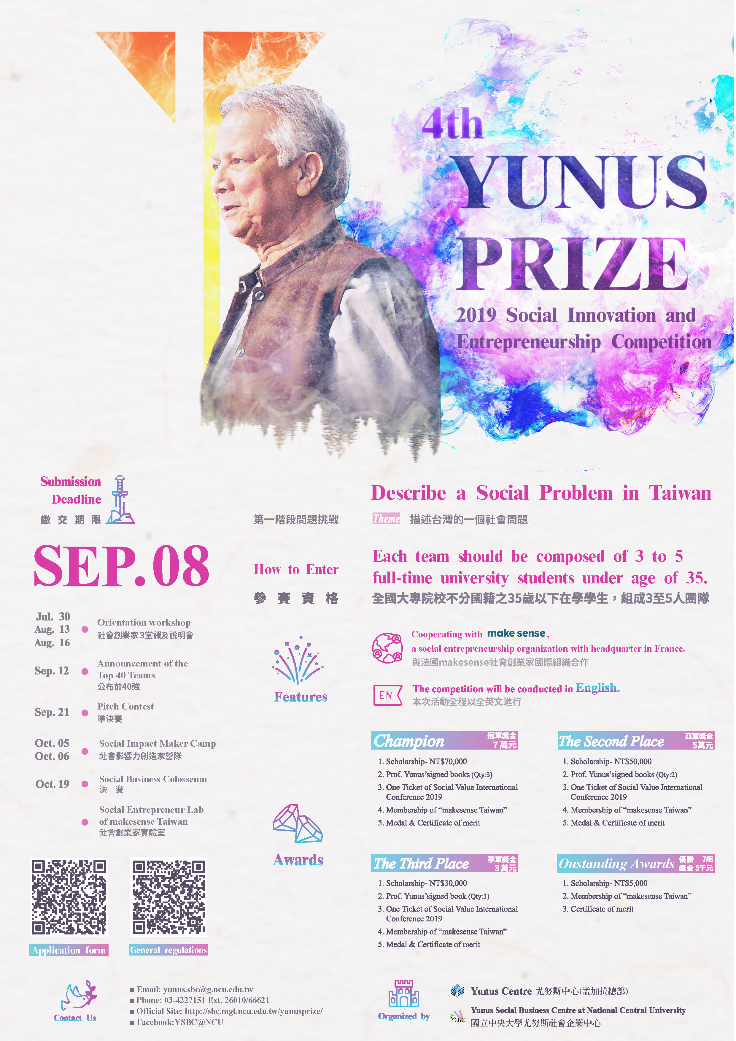 【尤努斯獎】第四屆社會創新與創業競賽-徵件開跑 聽說這一屆...不太一樣?! Yes!!! 1.競賽與培訓課程「全程英語」-培養團隊日後打國際盃 2.比賽形式很有趣-準決賽Pitch、決賽Pecha Kucha! 3.與法國makesense在台分支makesense Taiwan合作,提供跨國的資源與人脈網絡! - Are you ready for the challenge? 第一階段問題挑戰:Describe a Social Problem in Taiwan - 【社會創業家課程暨競賽說明會】 不限身份免費入場 ★台北場 - 社會創新實驗中心 (B1教室) 日期:8月16日(五) 10:00-13:00 講題:What pain? So what? Now what? Social Impact Pitching 講者:David A. Hall (CEO, United States Business Consultancy Taiwan) ★線上報名: 優先幫你保留席次! https://forms.gle/mfdb4sUwyU7F3cpv9 - 【競賽資訊】 ★參賽資格:全國「大專院校不分國籍」之「35歲以下在學學生」。須組隊報名,每組成員3人至5人,每人僅限參與1隊。 ★參加方式:於期限內上網填寫報名資料並上傳英文簡報,簡報以「Describe a Social Problem in Taiwan」為主題,描述你想解決的台灣社會問題,頁數以5分鐘內可簡報完畢為製作標準,內容格式不拘。 ★報名繳交網址:請至以下網址填寫報名表及上傳英文簡報。 https://forms.gle/XoTLLENibmcRVaCm7 ★截止收件時間:2019年09月08日23:59 (GMT+8)。 ★簡章下載:競賽詳細規則請詳閱簡章 https://pse.is/EABEN 。 - 【重要日期】 09月08日:截止收件 09月12日:公布入圍名單 09月21日:Pitch Contest (準決賽) 10月19日:Social Business Colosseum (決賽) - ★報名參賽: https://forms.gle/XoTLLENibmcRVaCm7 ★報名課程+說明會: https://forms.gle/mfdb4sUwyU7F3cpv9 ★下載簡章: https://pse.is/EABEN - 【主辦單位】 Yunus Centre、國立中央大學尤努斯社會企業中心 【協力夥伴】 makesense Taiwan、台灣社會影響力研究院(Social Impact Institute of Taiwan)、社會創新實驗中心、臺中社會創新實驗基地、勞動部勞動力發展署 桃竹苗分署 - 最新消息一律公布於官網及FB粉絲專頁 http://sbc.mgt.ncu.edu.tw/yunusprize/ - 【聯絡我們】 FB粉專直接私訊: https://www.facebook.com/YSBC.NCU/ 官方LINE收通知: https://line.me/R/ti/p/%40neu6268h call熱線和我們聊聊: 03-422-7151分機26010、66621 e-mail提問: yunus.sbc@g.ncu.edu.tw 競賽官網: http://sbc.mgt.ncu.edu.tw/yunusprize/ 附件1:中文簡章_尤努斯獎_第四屆社會創新與創業競賽.pdf |