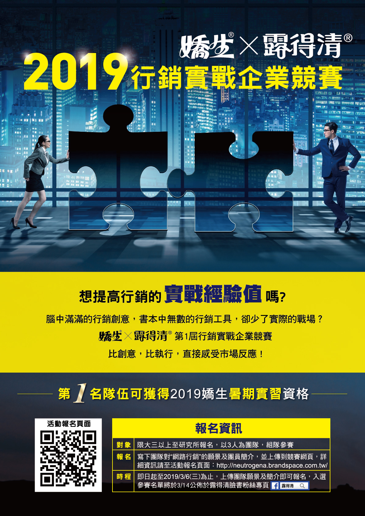 誠摯邀請國際企業學系所對品牌行銷有興趣的同學組隊報名,累積行銷實戰的經驗,並領先獲得嬌生的暑期實習機會! 詳細活動辦法可以至活動網站參閱:http://neutrogena.brandspace.com.tw