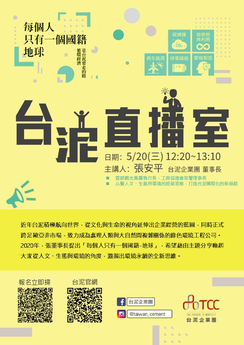 台泥集團張安平董事長將和台大同學們分享有關循環經濟在產業中的發展與作為,以「每個人只有一個國籍,地球」為主題,從人文、生態及環境的角度看待循環永續的新思維;演講尾聲中也將提供社會新鮮人進入職場前的生涯發展建議,更歡迎同學們的提問。 《台泥直播室-活動資訊》